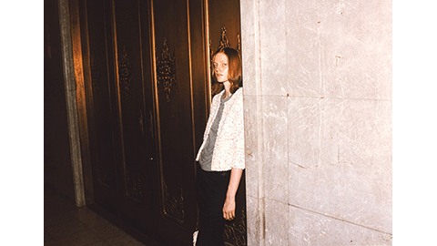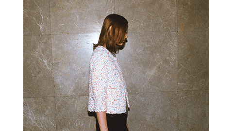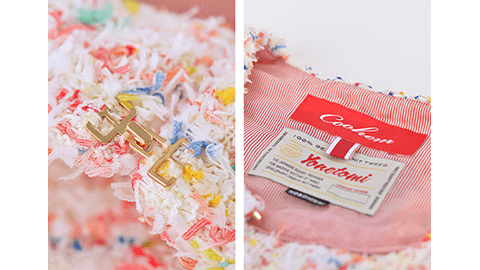 このノーカラーのツイードジャケットは、「Coohem」ブランドを代表する最もベーシックなデザイン。羽織ると背中のプリーツが開き、女性らしいラインが現れます。
