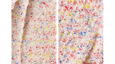 注目すべきは、このキュートな柄。白を基調に、レッドやエメラルドグリーンなどの鮮やかな羽根が散りばめられた5本の糸を使い、「交編」という技術で編み上げました。愛らしさの中にも品のあるテキスタイルで、動くたびに糸についたスパンコールがさりげなく光ります。