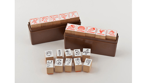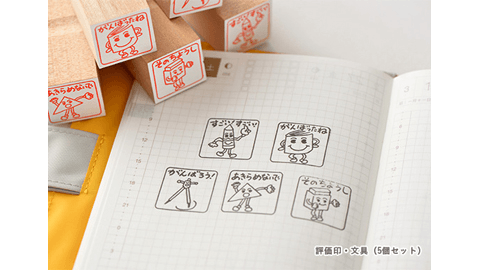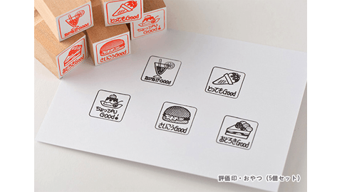 「評価印・文具」「評価印・おやつ」は、学校の先生が昔テストや宿題に押してくれたようななつかしい雰囲気のハンコのセットです。「評価印・文具」は、“がんばったね"“そのちょうし"といった元気がもらえそうな言葉のハンコ。「評価印・おやつ」は、“さいこうGood"“おどろきGood"などの“Good"なコメントのハンコです。日々つづけていることを振り返るときなどにお使いいただけます。