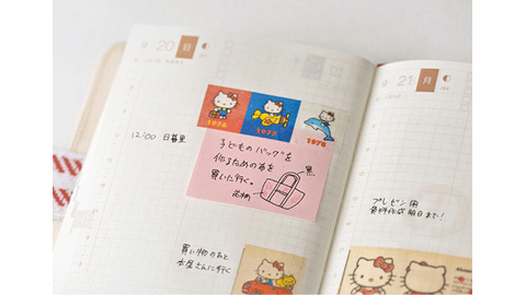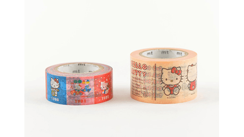 ほぼ日手帳2016の手帳カバーとしても『トリコロール』、『ポルカドット』が登場しているハローキティをモチーフにしたマスキングテープです。歴代のキティが年号とともにずらりと並ぶ赤、白、青が基調の「歴史」(幅20mm)とマスキングテープ自体が英語のハローキティ図鑑になっている「図鑑」(幅30mm)の2種類です。どちらもさまざまな柄をたのしめるのが特長です。「Hello Kitty 70’s」の手帳と合わせて使っても、かわいいです。