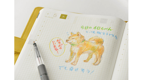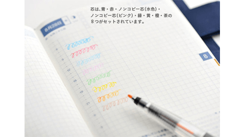 色鉛筆の芯を8本装填することができ、頭の部分を回転させて芯を選択し、使います。色芯6色(赤、青、緑、茶、橙、黄)と、コピーしたときに線が写りづらいノンコピー芯2色がセットになっています。「ほぼ日手帳WEBSHOP」では「ブタフィーヌさん」でおなじみのたかしまてつをさんが、手帳と一緒に愛用していたことがきっかけで、取り扱いをはじめました。8色の色鉛筆を手軽に持ち歩ける便利さはほかのペンではなかなか代用できません。専用の替え芯(8種類・各2本入り)と鉛筆削り器もついた、うれしいセットです。手帳にイラストを描いたり、マークをしたり、色を添えたりしたいかたにおすすめです。