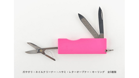 スイスアーミーナイフで有名な老舗ナイフメーカー「ビクトリノックス社」が、男女問わず携帯しやすいようにとデザインしたきれいな色の小型マルチツールです。ホワイト・ミントグリーン・ピンク・アップルグリーン・イエロー・カプリブルーの全6色。 はさみ、小型ナイフ、爪やすり、ネイルクリーナー、キーリングという、日常で特に役立つ5機能が小さな本体にまとまっています。とても軽く、見た目もシンプルですが、ナイフもハサミも精巧な造りでよく切れます。キーホルダーのように鞄につけておくと、ふとしたときに、とても役立ちます。