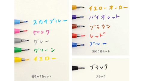 筆ペンのようなタッチで書ける水性カラーペンです。鮮やかな発色の水性染料カラーインキは、手帳のような薄い紙でも裏写りせず、比較的乾きやすいのが特徴です。書き心地もなめらかで、字やイラストの線に簡単に強弱をつけることができます。使い始めは固く感じられるかもしれませんが書いていくうちに、先が筆のようになっていきます。カラフルな「明るめ5色セット」と、落ち着いた色味の「渋め5色セット」に加え、ことしからは、使い勝手のいい「ブラック」もお選びいただけるようになりました。