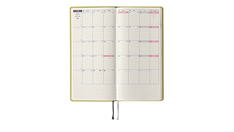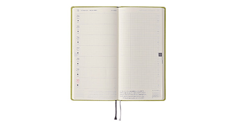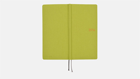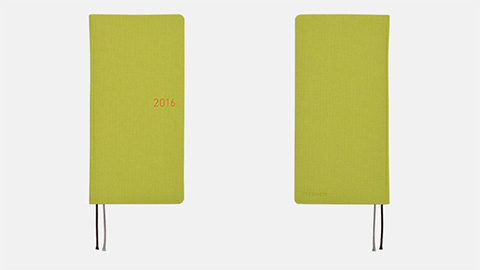 シンプルながら個性的な5色の「カラーズ」。ザラッとした手触りの表紙にはドイツの書籍装幀用の生地が使われていて、洋書のような雰囲気をかもし出しています。明るいイエローグリーンの「キウイ」には、表紙の「2016」の文字に元気いっぱいのオレンジを選びました。ビタミンカラーを組み合わせたWEEKSで、この1年を活発に過ごすことができそうです。印象を変えてみたいときには「柄入りクリアカバー」との組み合わせもおすすめ。