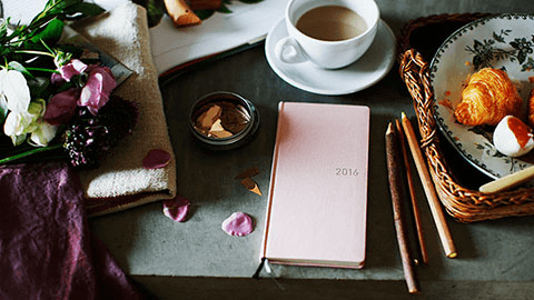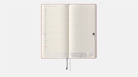 シンプルながら個性的な5色の「カラーズ」。ザラッとした手触りの表紙にはドイツの書籍装幀用の生地が使われていて、洋書のような雰囲気をかもし出しています。やわらかな印象の「ペールピンク」に合わせて表紙の「2016」にはグレーを選び、春の空気をイメージしました。かわいらしく、落ち着きのあるピンクで、大人が持つのにもちょうどいい色合いです。印象を変えてみたいときには「柄入りクリアカバー」との組み合わせもおすすめ。