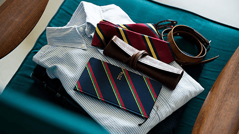 ネクタイ生地をWEEKS用に仕立てた「タイ&チーフ」シリーズ。ネクタイ生地を使っているため凹凸の肌触りが心地よく、光沢の美しさが特徴です。スーツやシャツとの相性がよく、ビジネスシーンにもなじみやすいWEEKSです。「レジメンタルストライプ」は、イギリス海兵隊「Royal Marines」の連隊旗をモチーフにした正統派のデザイン。光沢感のあるネイビーをベースに、赤、緑、黄色のラインが入ったストライプで、折り目正しい印象のWEEKSです。