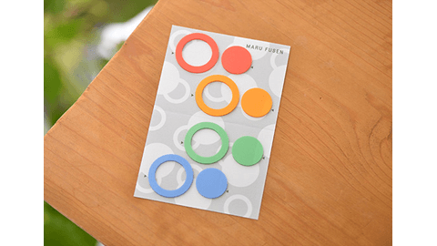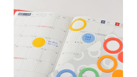 手帳カバーのポケットに入れて持ち運べる、「リング」と「まる」のフィルムふせんのセットです。オリジナルやカズンの手帳の月間スケジュールのマス目に貼るのにちょうどいいサイズの2種類のふせんが各4色ずつ入っていて、便利に使うことができます。半透明で、書いた文字の上から貼れるほか、ふせんの上にさらに文字を書くこともできます。何度も貼ったりはがしたりできるのも特長。大切な予定を目立たせたいときや、ページをデコレーションしたいときに役立ちます。