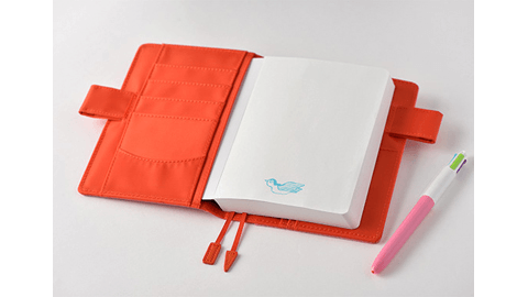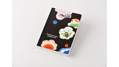 155枚の用紙が1冊にまとまった、文庫本サイズのメモ帳です。1ページごとにスッとちぎれる製本で、ちょっとしたメモを書いて誰かに渡したいときにも便利です。ことしのデザインはイラストレーターの大塚いちおさんにお願いしました。黒を基調にした表紙には「hobonichipaper(s)」のことばとともに、かわいい鳥や蜂、うさぎや蝶、花などの絵が描かれています。中のペーパーは無地ですが、ワンポイント、大塚さんの鳥のイラストが明るい水色で印刷されています。