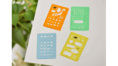 手帳を書くときに役立ちそうな記号やマークを集めたほぼ日オリジナルのミニ・テンプレートです。かわいいマークが、手帳のページをよりたのしい雰囲気にしてくれます。手帳にはさんで持ち歩くのにも、ちょうどいいサイズです。(テンプレートとは、製図をするときなどに、正確な図を描くための道具です。なぞるだけで記号や線、マークなどをきれいに、同じ形で描くことができます)