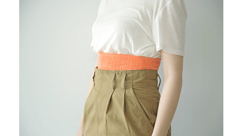 オレンジとピンクの中間のあざやか色の、pochi。透かし柄なので、季節を問わず巻きやすいです。「今日は暑いけど、おなかは守っていたい」というときに、ちょうどいいんです。伸縮性もあり巻き心地もよく、でも、ムレない。いままでのタオリンハラマキを巻いたことのある方にも、ハラマキビギナーの方にも、オススメです。