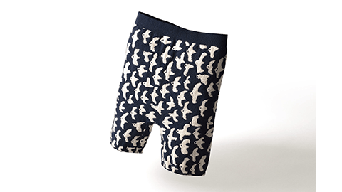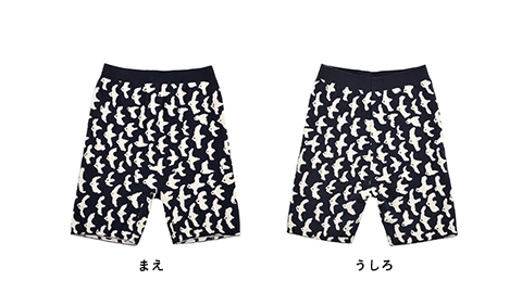 塩川いづみさんによる紺地に、白いトリが群れで飛んでいるような柄。トリの中には、おばけのような形の子や、みんなと逆方向に飛んでいる子が、1匹だけいます。とってもかわいいですよ。