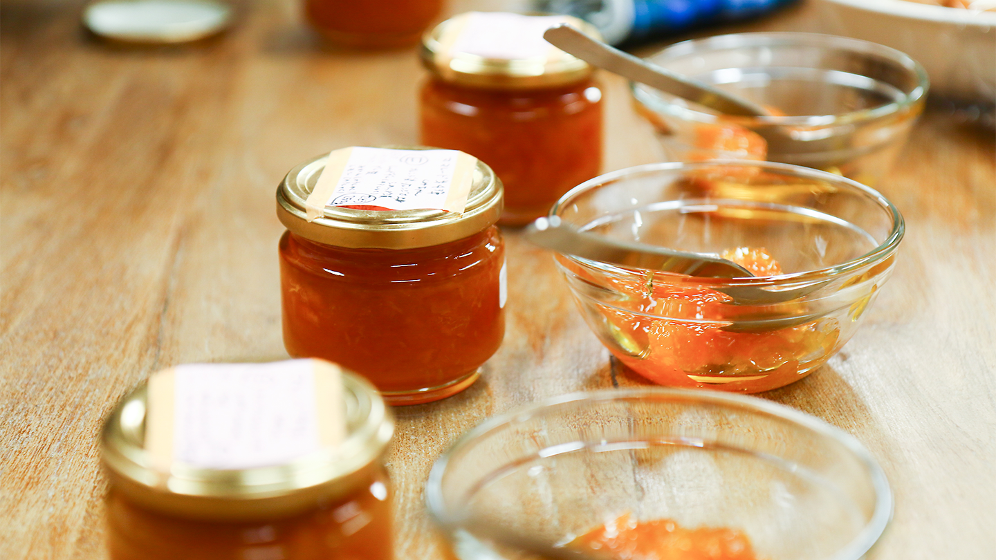 - 「おらがジャム」「感じるジャム」は場合によって、果実の実や皮などのほか、くだものの仕込みをしたときの葉片などが混入している場合があります。こちらは果実由来のものですので、取り除いてお召し上がりください。まれにみられる茶色い細片はジャム加工の過程で果実の色が濃くなったものです。品質に問題はございませんのでそのままお召し上がりいただけます。