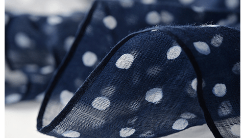 クラシックだけれど、あたらしい。そよそよ吹く風に、ふわりと舞いあがるくらいのかるさ。そして、光をきれいにとおす、透け感。うんと薄い麻の織物をつかって織りました。水彩で、1点ずつ手描きした「みずたま」をもとにしたプリントも、じつはとても高度なわざ。水彩ならではの滲(にじ)みや濃淡をいかすため、手捺染という、シルクスクリーンのような技法で、みずたま部分だけで2版を使ってプリントし、さらに紺地を1版重ねています。ちなみに「リュシオル」は、フランス語で「蛍」の意味。