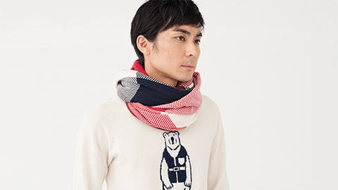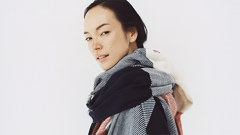 ストールサイズのくびまきは、「まく」だけでなく、「羽織る」あるいは「着る」ように、まとうことができるのもいいところ。