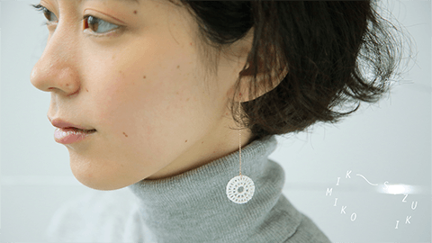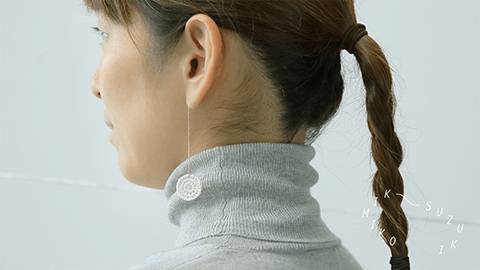 ペースト状にした磁土でレース模様を一点一点描いて焼き締めた一点もののシリーズです。強度を保つため、3~5回層にして高温焼成しています。金属部分は上品な光沢のK10YGを使用しています。装着時、チェーンの長さを調節できるのもポイントです。