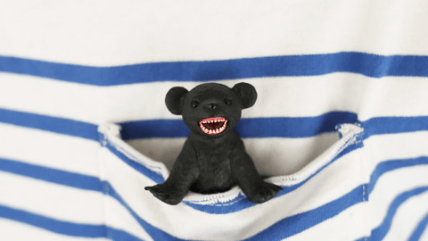 手のりサイズの「誤解されやすいくま」です。ちいさいですが、いっちょまえにするどい歯と、とがった爪を持っていますので、そこだけ、ちょっとご注意を。ポケットやかばんにしのばせて連れて歩くもよし、ちいさなものを持たせたり、くわえさせたりして、ちょっとしたことに役立てることもできます。置き台としても使える、くまのぬいぐるみ的質感の「くまん箱」に入れて、おとどけします。