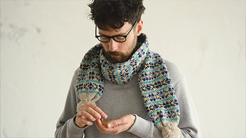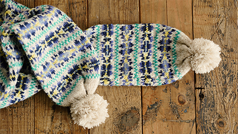 色合いがとてもさわやかなフェアアイルのマフラーが編めるキットです。詳しい説明はこちら。