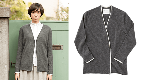 気がるにさっとはおれる、カシミア100%のカーディガンです。編み地をもうすこし厚いものに。さらに前立て部分と袖口に、アイボリーのパイピングをあしらいました。ごくシンプルなデザインですが、きちんとした、清潔感があるのが特長です。色はミディアムグレーとネイビー、使いやすい2色を用意しました。シーンをえらばず着ていただけるカシミアです。