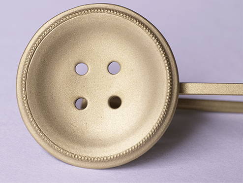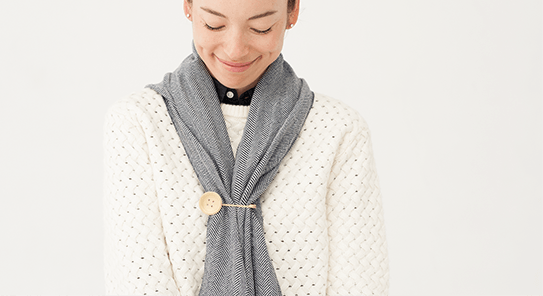 今回のテーマは、ボタン。大小2種類のシンプルなボタンが、大きな安全ピン型の留め具についています。