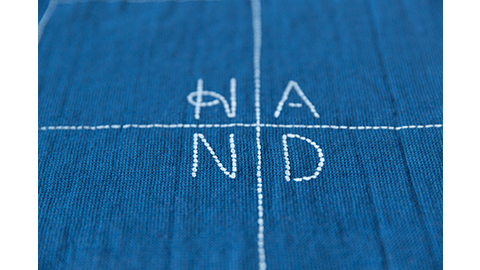 立体感のある刺し子のような点線は「白顔」(はくがん)という技法でのプリント。「手染めの綿や、洗った藍染めのような印象にしたい」というディレクションをもとに、通常の平織りではなく2色に先染めした糸を縦横に1本おきに配置することで、独特な織り柄がうまれました。