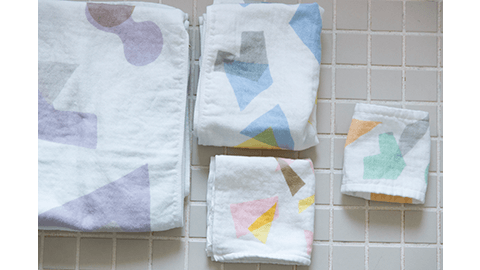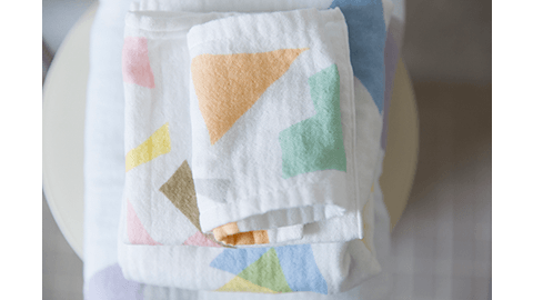 うすい色のセロファンを切り絵のようにちりばめたような色彩。ちょっとむかしの、砂糖菓子のような、あるいはかき氷のような、透明感のある重なる色のハーモニーを、6版をつかって、プリントで再現したタオルです。ブルーが基調なので、すずしい印象。夏のおでかけにもぴったりですよ。ランダムなデザインですから、たたむ場所によって表情が変化するのもたのしいところ。