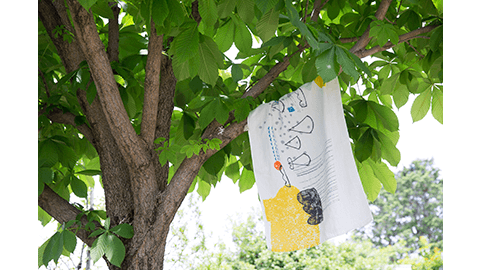 抽象的な絵画のようですが、横位置にすると、具体的にあるものが描かれているのがわかります。それは、日本の四季。春夏秋冬がうつろうさまを、雲、山、雨、太陽などをモチーフに、まるで「屏風絵」のように描かれているんです。タオルを「巻く」と、その四季が、おわりなく、つづいていく。