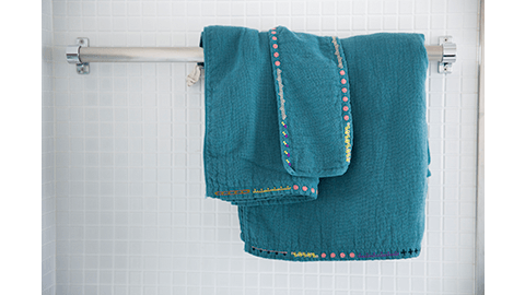 - 片面ガーゼ、片面パイルの二重織りのため、両面パイルのタオルの「厚さ」や「重さ」とは質感が異なります。