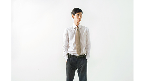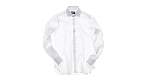 “ワイドカラー”は、ボレッリ社では“ルチアーノ(Luciano)”という名前で知られている、定番のひとつ。ネクタイを締めたときに、とてもきれいに決まり、日本市場でもたいへん人気が高いかたちの襟なんです。このワイドカラーシャツの素材には、「ヘリンボーン」(杉綾)をえらびました。それも、目を凝らさないとわからないほどのこまかな織り。海島綿とスーピマ綿の交配種であるマスターシードコットンの糸を細くつむぎ、やわらかく織っていますから、とてもソフトな感触。ヘリンボーンならではの光沢も出ています。ちなみに生地をつくる工程は、日本国内でおこなっています。それをイタリアに送り、ボレッリ社が縫製。かたちは、まったくのイタリア仕様ではなく、メンズのシャツはフィット感が大切であると、日本人の体型に合うスタイルを採用しています。