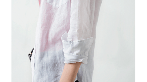 リネンのシンプルなシャツのいいところは、洗って、そのまま伸ばさずに乾かせば、アイロンをまったくかけずに着ていただけること。「らくちん」で「おしゃれ」です。もちろんこのシャツも「くしゅくしゅっ」と着て、様になる。カジュアルなのに、ふわっと香りたつような品があります。しかも、後ろのラインのウエストがきれいにシェイプされたパターンなので、「飾らないのに、女性らしい」印象が出ます。前ボタンをすべてとめてもいいですし、ひとつ、あるいはふたつ開けてもかっこいい。襟を立てて着るのもいいでしょうし、透け感をいかして、重ね着として、前ボタンをすべて開けて羽織るように着ても、いいですよね。