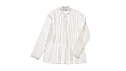 髙品質なリネンの織り地、スタンドカラーの襟、前身ごろにこまかなピンタック、裾にはゆったりしたドレープ。着ると、腰のあたりに自然な「くびれ」がうまれる。まるでヨーロッパの(それも、フランスやイタリアの)アンティークのような雰囲気をもったドレスシャツです。今回のラインナップのなかで、とりわけ個性的で、女性らしい1枚かもしれません。最初、触ると、すこしだけ硬さを感じるかもしれませんが、着て、洗って、乾かして、それをくりかえしていくうちに、どんどんしなやかになっていきます。