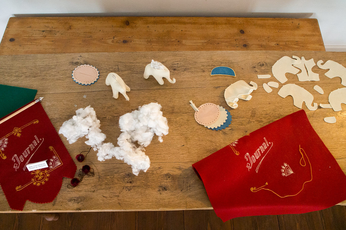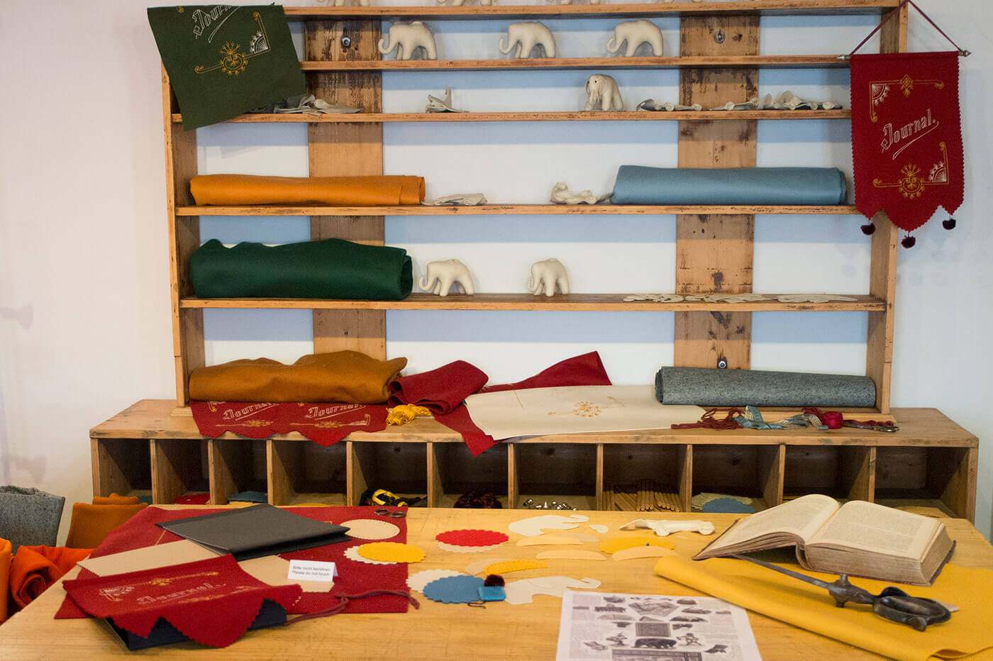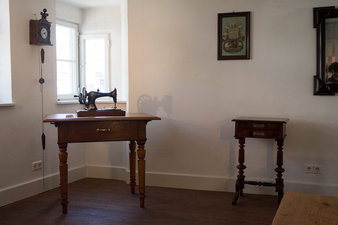 マルガレーテさんが使っていたミシンを再現した展示の前で