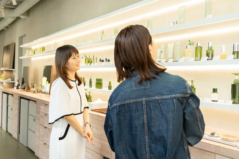 草場 順番にお話を伺いたいんですが、 まず、「リフレッシング デオドラントミスト」から。 私は自分でけっこう汗をかく方だと思っていて、 春から秋にかけて使っています。 汗の匂いで他の人を不快にさせたくないし、 何より自分自身が汗臭いのは嫌だなぁというときに これに出会ったんですけど、 もうほんとうに気持ちがよくて。 シュッシュッってつけた後、 ほんのり清涼感があって、 長時間、自分の臭いが気にならずに済むのが すごくうれしいです。 パウダーが入っているものは、 肌や服が白くなることもあるので、 つけるときに注意が必要ですけれど、 これはパウダーフリーのミストタイプなので 使い勝手もとてもいいです。