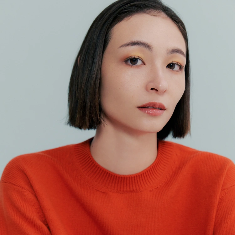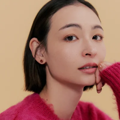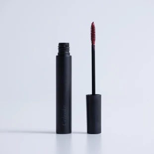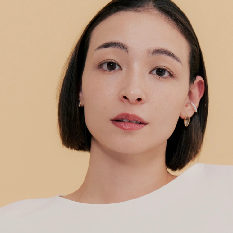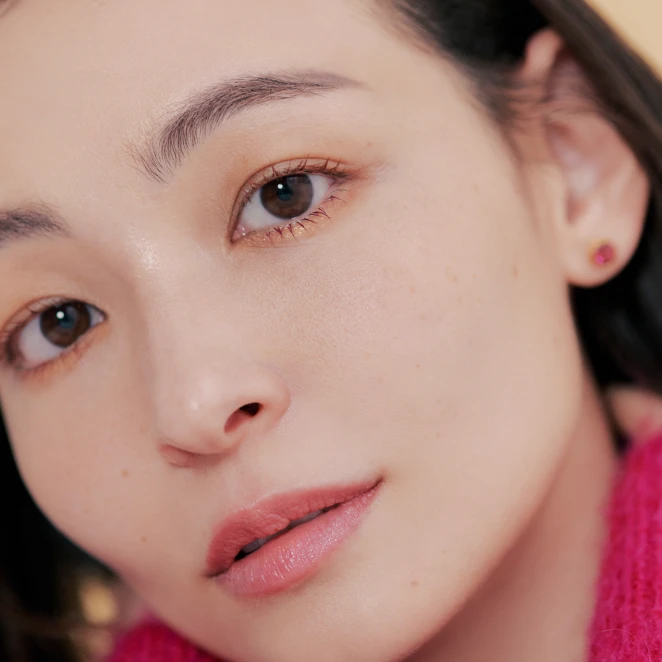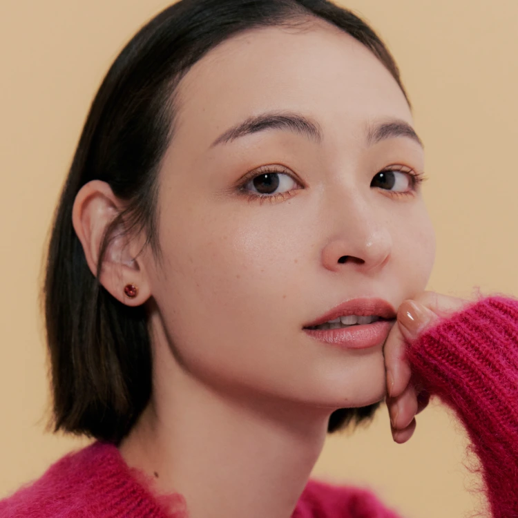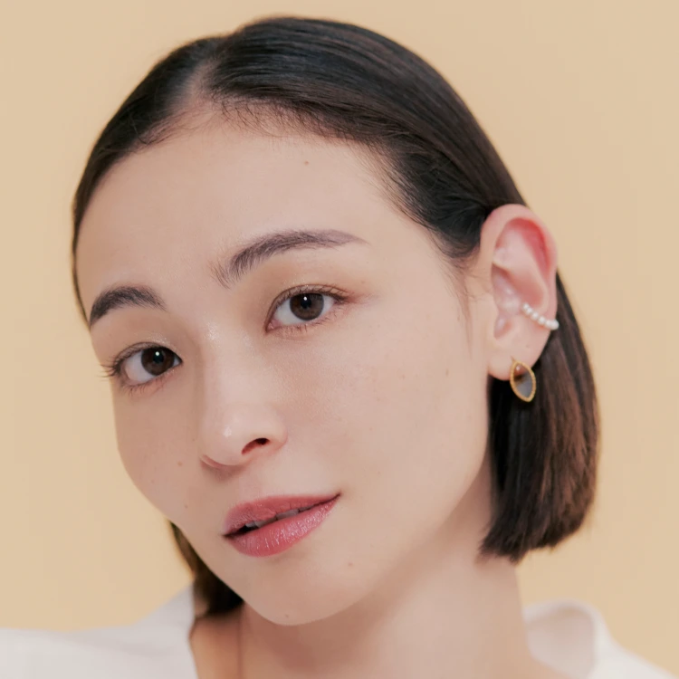 上のまつ毛には柿色(パーシモン)、 下まつ毛には鮮やかな赤のマスカラを使ったメイク。 アイシャドウには、肌なじみのいい ベージュ系のカラーをのせて、 目元全体をまろやかに仕上げました。 下まぶたの中央だけに入ったゴールドが さりげない光を放ちます。