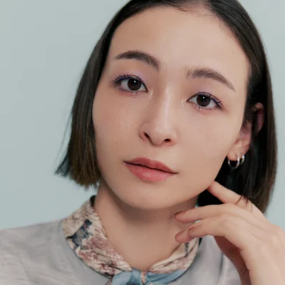 上のまつ毛をブルー、 下のまつ毛をグリーンブルーのマスカラで彩ったメイク。 上下とも同系色でありながら、 微妙なカラーの違いをたのしめます。 アイシャドウにはマスカラの色と相性のいい、 青みを含むパープル、ピンクの色を合わせました。