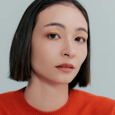 モスグリーンのマスカラがしっとりと映えるメイク。 マスカラの色が際立つ、 イエロー、オレンジのアイシャドウを合わせました。 まぶたの位置によって使う色を変えることで、 明るすぎず、引き締まった印象の目元に仕上がります。