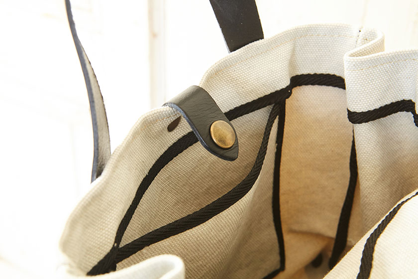 底の革パーツや持ち手、留め具がアクセント。