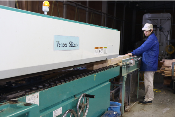 スライスして出来た単板に接着剤を塗り、重ねあわせる。