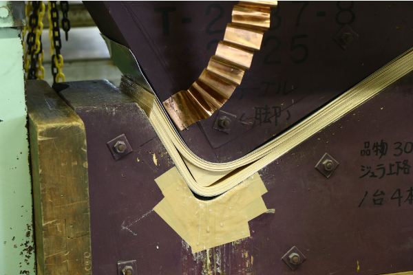 ▲機械に通して、単板の両面に接着剤を塗ります。