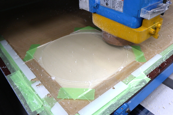 透明のアクリル板を、一枚一枚、丸くカットします。