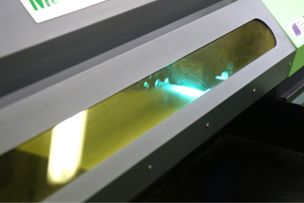 ▲UV印刷をしているところ。ちょっと、日焼けマシーンのよう。