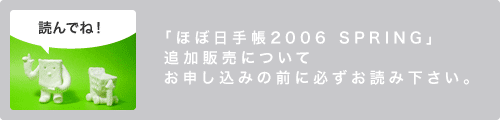 2月23日(木)午前11時から 3月2日(木)午前11時まで ※万が一販売期間中に売り切れてしまったら、 その時点で販売を終了いたします。 「ほぼ日手帳2006 SPRING」追加販売では 総計約2500セットが今回の販売準備数となっております。 各商品ごとの最新の在庫数は、こちらをご覧ください。 なお、販売準備数量が、 販売期間中に売り切れてしまったら、 その時点で販売を終了いたします。 「ほぼ日手帳2006」SPRINGについて くわしくはこちらのページをご確認ください。 また、各商品の使用方法や 商品について、 あらかじめ知っておいていただきたいことについても こちらのページでご案内しておりますので、 ご購入の前に、かならずご確認ください。 「ほぼ日手帳2006 SPRING」追加販売でお求めいただいた場合には、 2月28日(火)以降、 3月上旬までにすべての出荷を終えるよう 順次、出荷を行ないます。 商品の発送が終了次第、 ご注文の際に登録いただきましたメールアドレスに 出荷完了のお知らせメールをお送りします。 ※お申し込み受付後、商品の準備が出来たものから 順次、配送の手配を行いますので お申し込み内容の変更・キャンセルはご注文いただいた日の翌営業日 午前10時までにお願いいたします。 ※商品が出荷準備に入っている場合、 お申し込み内容の変更をすることは できませんのでご注意ください。 ※販売期間終了後は、 商品内容の変更・キャンセルをお受けできませんので あらかじめご了承ください。 ■国 内 ・ヤマト運輸(クロネコヤマトの宅急便)でのお届けとなります。 国内への配送手数料は、全国一律630円です。 ■海 外 ・国際スピード郵便(EMS)でのお届けとなります。 海外への配送手数料は、 EMS送料と事務手数料の500円を合わせた金額となります。 EMS送料は地域と重量によって金額が異なりますので 料金はこちらのページでご確認ください。 また、それぞれの商品重量は こちらのページでご確認ください。 ご利用可能なお支払い方法は国内と海外で異なります。 それぞれのお支払い方法によって お支払時期も異なりますので、 下記の表をご確認ください。