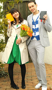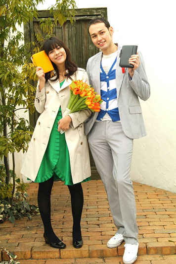 女性は、あざやかなグリーンのドレスに、 さらに強い差し色として、 明るいマンダリンオレンジの手帳をあわせて、 色を積極的にたのしんでいる、 きれいで華やかな印象に仕上げました。 男性は、かなり軽いカジュアルな服装なので、 高級感のある革のブルーブラックの手帳に 引き締め役になってもらって、 大人っぽい雰囲気をキープしています。 (スタイリスト・古賀雅依子)