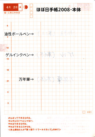 | 「無料お試し版」をご注文いただいたみなさまへ 先日は「無料お試し版」をご注文いただきまして、 まことにありがとうございました。 10月20日にこちらのページで お伝えしておりましたとおり、 「無料お試し版」で使用している紙と、 「ほぼ日手帳2008・本体」で使用している紙は、 仕様が若干異なることが判明いたしました。 すべてのかたに正式な仕様の 「無料お試し版」をお使いいただくため、 すでに「無料お試し版」をお申し込みいただき、 お手元に届いているというみなさま全員に、 あらためて、新しい「無料お試し版」を お送りすることにいたしました。 ◆どこが異なっていたか、ご説明します。 「無料お試し版」で使用している紙と、 「ほぼ日手帳2008・本体」で使用している紙は、 ともに「トモエリバー」という銘柄です。 紙の厚みも、斤量が52g/m2という点では同質なのですが、 「ほぼ日手帳2008・本体」で使用している紙は、 「トモエリバー(手帳)」、 「無料お試し版」で使用している紙は、 「トモエリバー(マット)」という違いがありました。 「トモエリバー(マット)」は、 「トモエリバー(手帳)」とくらべて、 「表面のツヤ感を押さえる」仕様になっているのが 主な違いです。 この2種類の紙は、 見た目、手触り、書き心地などに ほとんど違いはないのですが、 「トモエリバー(手帳)」は耐水性がやや高いという 性質があります。 これは、万年筆や太めの水性ペンといった インクの出量が多い筆記具で記入したとき、 インクが滲みにくく、 裏うつりしにくいという特長になるのですが、 「トモエリバー(マット)」は、 万年筆や太めの水性ペンで書いたときに、 より強く、裏うつりがみられます。 実際に、今回の「無料お試し版」と 「ほぼ日手帳2008・本体」それぞれで、 筆記テストを行った結果をごらんください。