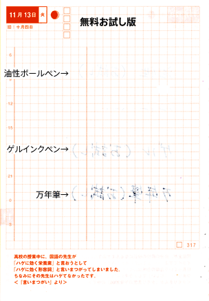 ※筆圧など個人差がございますので、 あくまでも参考としてご理解ください。 上記の画像のとおり、 油性ボールペン、ゲルインクペン(ペン先細め)などで 書き込んだ場合は、 「無料お試し版」と「ほぼ日手帳2008・本体」で、 裏うつりについての違いは、ほとんどないのに対し、 万年筆や太めの水性ペンで書いた場合には、 裏から見たところに、違いが見られるのが おわかりいただけるかと思います。 ◆普通郵便にて、正式な「無料お試し版」をおとどけします。 今回の事態について、簡単な経緯をお伝えします。 本来、「無料お試し版」についても、 「ほぼ日手帳2008・本体」と同じ 「トモエリバー(手帳)」で作成すべきところ、 担当している印刷会社において、 製紙業者に、紙を発注する段階で、 紙の指定に間違いがあったことが判明いたしました。 私どもも、みなさまにお届けする前に、 製本前のチェックの段階で、 万年筆など複数の筆記具を使って筆記確認をするなどして、 紙の違いについて気がつくべきでしたが、 結果、お届けするまで気がつくことができず、 ご注文していただいたみなさまには、 本当にもうしわけなく思っております。 今回の件につきましては、 「無料お試し版」を手にしたかたから、 現在お使いいただいている「ほぼ日手帳」と 紙がことなるのではないかというご指摘をいただき、 印刷会社に問い合わせた結果、 判明いたしましたものでした。 ご指摘くださったみなさま、 ほんとうに、ありがとうございました。 今回の件について、印刷会社とともに、 私たちなりの最善の対応について 検討してまいりましたが、その結論として、 「ほぼ日手帳2008・本体」で使用しているものと同じ 「トモエリバー(手帳)」で作成した 新しい「無料お試し版」を、 普通郵便にて、再度お送りさせていただくことにいたしました。 現在、日本国内にお住まいのかたには 10月末までにお届けできるように、 また、海外のかたにも、なるべく早く お使いいただけるよう、 正式な紙での印刷・製本作業をおこなっています。 お届けまで、いましばらく、お待ちください。 ◆古い「無料お試し版」について。 すでにお届けしました「無料お試し版」については、 万年筆や太めの水性ペンで 書き込んでいただいたときの裏うつりの問題以外、 書き心地、使い心地ともに、 「ほぼ日手帳2008・本体」とほとんど違いはありません。 ですので、万年筆や太めの水性ペンを お使いにならないというかたは、 そのまま問題なくご試用いただけます。 1日1ページという、「ほぼ日手帳」の特長を、 1か月間、おたのしみいただけたらと思います。 すでに、ご家族やご友人のみなさまに、 「無料お試し版」をお配りいただいている場合は、 大変お手数をおかけいたしますが、 先方さまがお使いになる ペンの種類(万年筆・太めの水性ペン)によっては、 新しい「無料お試し版」を再度お配りいただければ幸いです。 ご迷惑をおかけしまして、本当にもうしわけありませんが、 どうぞご協力いただけたらと思います。 このたびは、このような不備があり、 ご心配ならびにお騒がせをいたしまして、 大変もうしわけありませんでした。 なお、本件につきましては、 「無料お試し版」をご注文いただいたみなさまに、 個別にメールでもご連絡させていただきます。 最後までお読みいただき、 どうも、ありがとうございました。 (2007/10/23 更新) |