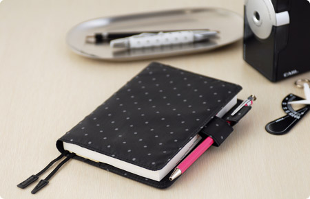 黒地にグレーの水玉模様。 揺らぎのある手書き風の水玉が、 まるで、空から舞い落ちる雪のようです。 エレガントな手帳になりました。