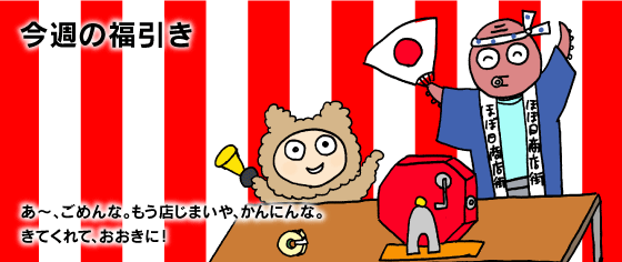 9月から毎週違う賞品をご用意して お届けしてまいりました「今週の福引き」は、 2009年1月1日午前11時を持ちまして、 終了させていただきました。 福引きを引いてくださったかた、 そして、このページをご覧くださったかた、 ほんとうに、ありがとうございました! ※当選した賞品が、 お手元に届いていないという方も 1月中にはすべてお届けする予定ですので、 お待たせして申しわけございませんが、 もう少しお待ちくださいね。
