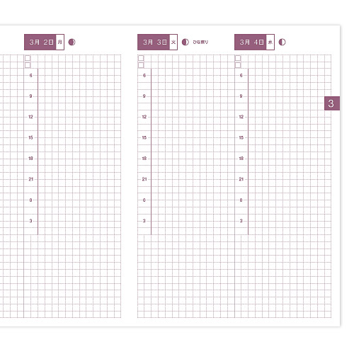 | 仕 様 | ・2日で1ページ(2009年1月1から2009年3月31日まで) ・2009年1月〜3月の月間カレンダー(月曜はじまり)つき ・メモ用3ページ ・3.45ミリ方眼 |