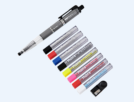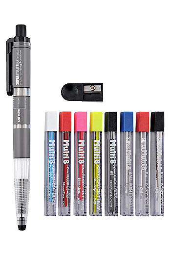 | 内蔵芯 | ボールペン(黒・赤・青)、蛍光芯(ピンク・イエロー) PPCノンコピー芯、赤芯、鉛筆芯(HB) 専用替芯8種(各2本入、芯径2ミリ)・芯削り器 ※PPCノンコピー芯:普通紙コピーに写らないブルー芯 本体サイズ:長さ140ミリ/軸径13ミリ |