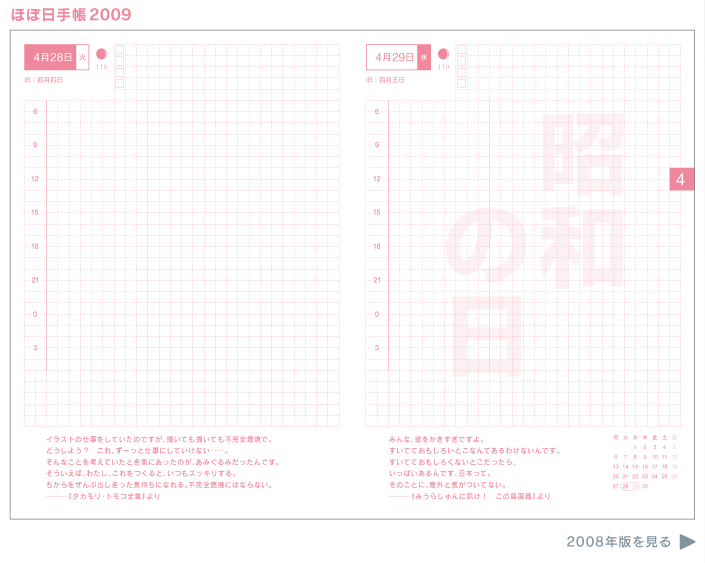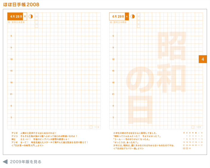 2009年版の手帳は、 グラフィックデザイナーの佐藤卓さんと相談しながら、 細かい改良を重ねました。 「いままでこの手帳を愛用していた人たちが 使いにくいものにならないように、 新しいものを足すのではなく、 いまあるものを少しずつチューニングしていきました」 そんな卓さんの視点から施された改良ポイントを ひとつずつ紹介していきます。