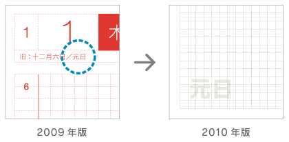 「ささいなことですが、1年のスタートは 新しいページではじめたいなぁと思います」 そんなご意見をいただきました。 2009年版の元日のページは、左ページに12月31日があり、 往く年と来る年が、ひとつの見開きになっていたのです。 たしかに! というわけで、元日を左ページに移動しました。 新しい年を、まっさらなページでお迎えください。